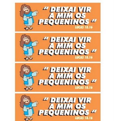 Bases Bíblicas para a evangelização de crianças A Bíblia manda evangelizar as crianças 1. "Ide... pregai o evangelho a toda criatura. (Marcos 16:15). A criança, também é uma criatura. Claramente a Bíblia nos mostra que uma criança pode se salvar 1. Crianças foram incluídas entre os "santos"de Éfeso (Ef. 1:1 com 6:1) A Bíblia prova que uma criança é pecadora e pode se perder 1. Todos nascem no pecado e são possuidores de uma natureza pecaminosa (Salmo 51:5; Romanos 5:12) A Bíblia ainda ensina 1) Jesus recebeu "perfeito louvor"da boca dos pequeninos (Mateus 21:16) "Apascenta os meus cordeiros" - APEC Não se esqueça que as crianças dependem de nós para mostrar-lhes o caminho certo. Falharemos? Quantas crianças da rua e vizinhança de sua casa e de sua igreja estão sendo alcançadas para Jesus? Quantas delas entram em sua igreja? |