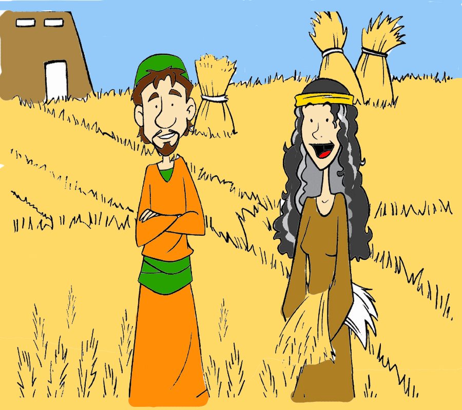 Lá em Belém morava um parente de Noemi chamado Boaz. Ele era um homem bom e amava a Deus. Boaz tinha uma grande plantação de cevada (sementes que servem para fazer bebidas) e Rute foi colher espigas de cevada justamente no campo deste homem. Quando Boaz a viu na plantação, logo quis saber quem era aquela moça. Ele ficou sabendo que Rute era nora de Noemi e como era bondosa com sua sogra. Boaz até deixou que ela colhesse mais espigas. Ele gostou muito dela. Eles se casaram e tiveram um lindo bebê, que se chamou Obede.