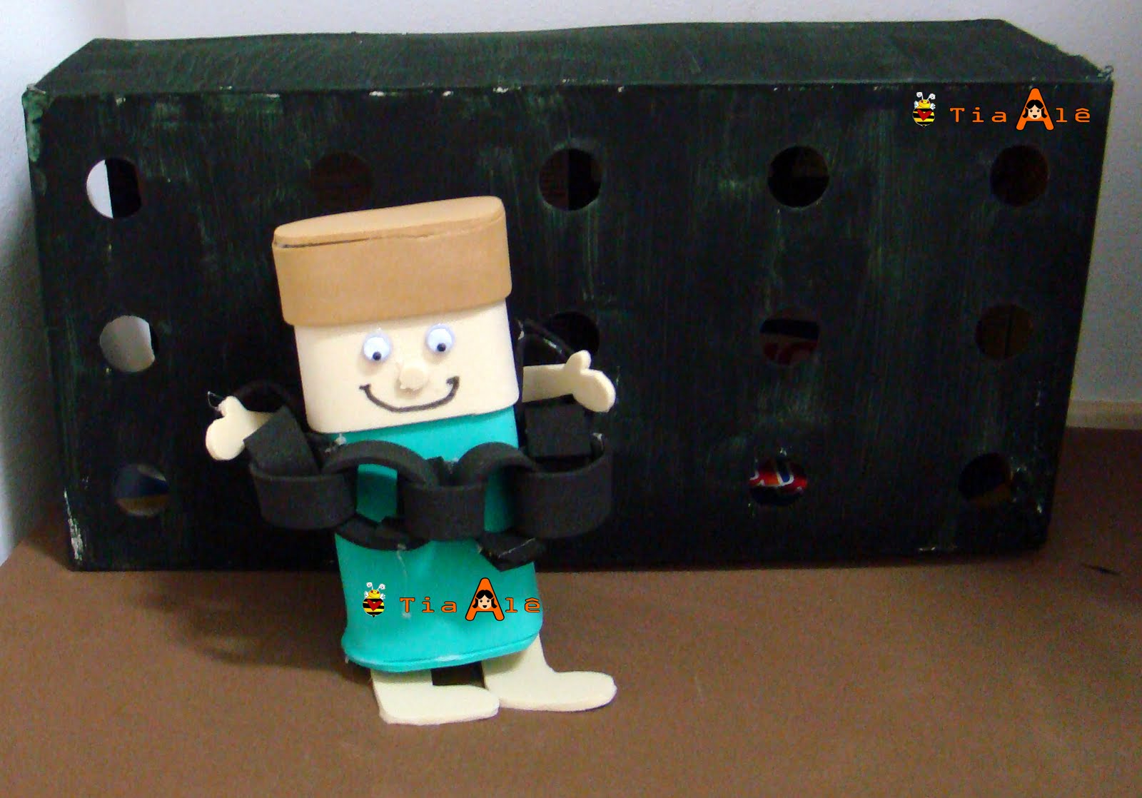 A prisão eu fiz com a caixa de um doce que já veio furada, e eu pintei de preto. Eu fiz uma abertura atrás para Pedro entrar.