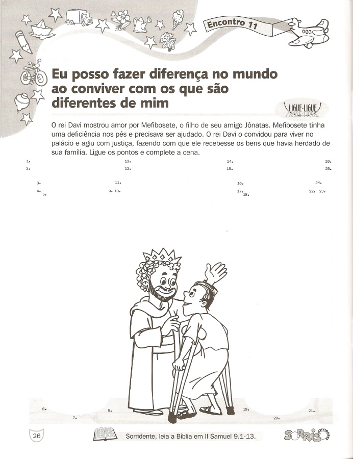 MAs a história que vamos ouvir hoje não foi no tempo de JEsus, aconteceu muito antes, no tempo do rei DAvi. Quem se lembra de alguma história sobre Davi? Lembram-se que Davi tinha um grande amigo que ser chamava Jônatas? Ele era filho do rei Saul. Certa vez DAvi e Jônatas fizeram uma promessa um ao outro. Jônaras disse a Davi: "...se eu morrer, trate minha família com bondade...". DAvi concordou.